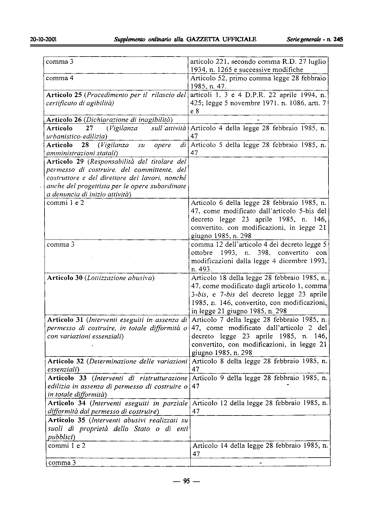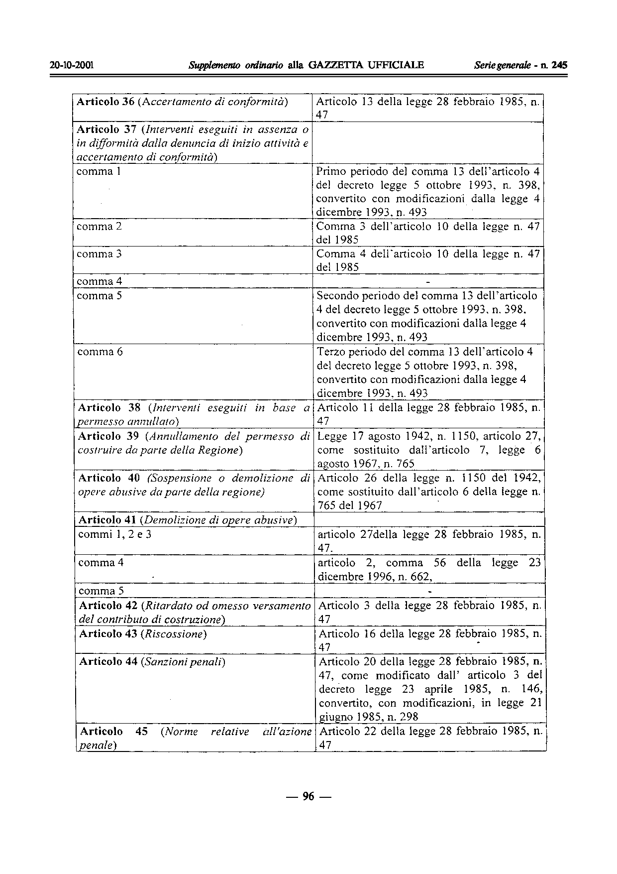 f)legge 28 febbraio 1985, n. 47, limitatamente agli articoli 3, 4, 5, 6, 7, 8, 9, 10, 11, 12, 13, 14, 15, 16, 17, 18, 19, 20, 21, 22, 25, comma 4, 26, 27, 45, 46, 47, 48, 52, comma 1;