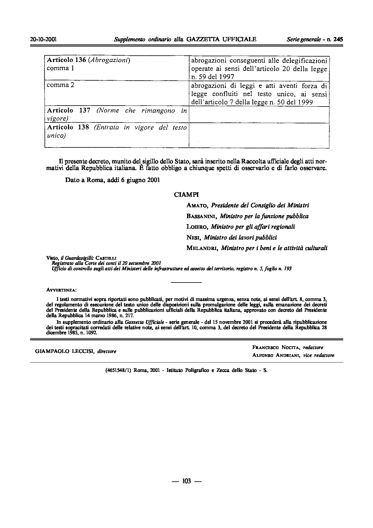 Visto l’articolo 1 della legge 16 giugno 1998, n. 191; Vista la legge 24 novembre 2000, n. 340, allegato A, numeri 12, 14, 46, 47, 48, 51 e 52;