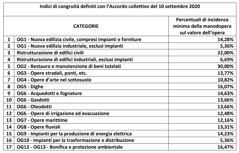 La verifica della congruità della manodopera impiegata avviene considerando gli indici minimi di congruità associati alle diverse categorie di lavori. Tali indici sono dettagliati nella tabella allegata all’accordo collettivo stipulato il 10 settembre 2020, sottoscritto dalle organizzazioni più rappresentative nel settore edile. È importante notare che questi indici sono soggetti ad aggiornamenti periodici.